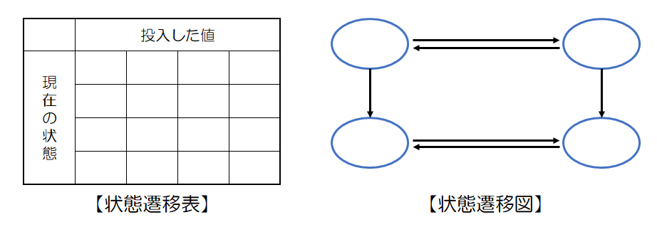 どの状態の時に、どの入力があると、どの状態に変化(遷移)するのかを示す規則を、表にしたものが状態遷移表、図にしたものが状態遷移図です。