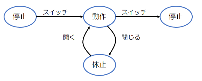 - 「電源スイッチON」という入力によって、状態は「動作」に遷移します。