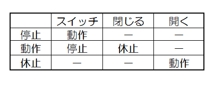 縦が遷移前の状態、横が入力、表の中は遷移後の状態を表しています。なお、標柱の横棒は遷移がないことを示します。