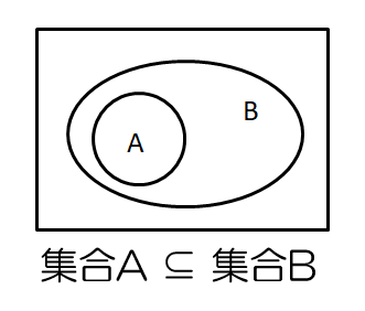 2つの集合の関係は、場合によっては下図のように、集合Aが集合Bに含まれる場合もある。この様な包含関係を表す演算子として「⊆」や「⊇」が用いられる。