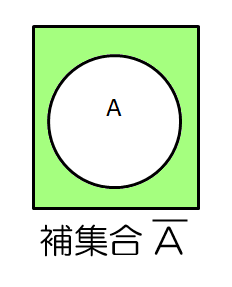 集合はよく「ベン図」で表されます。要素全体の集まりを四角で表し、そのうち集合に含まれる要素を色付きの円で示します。この時、集合に含まれない円の外側のことを補集合といいます。