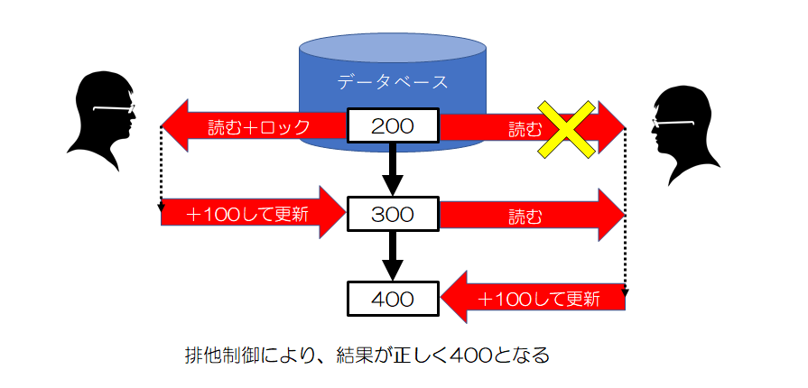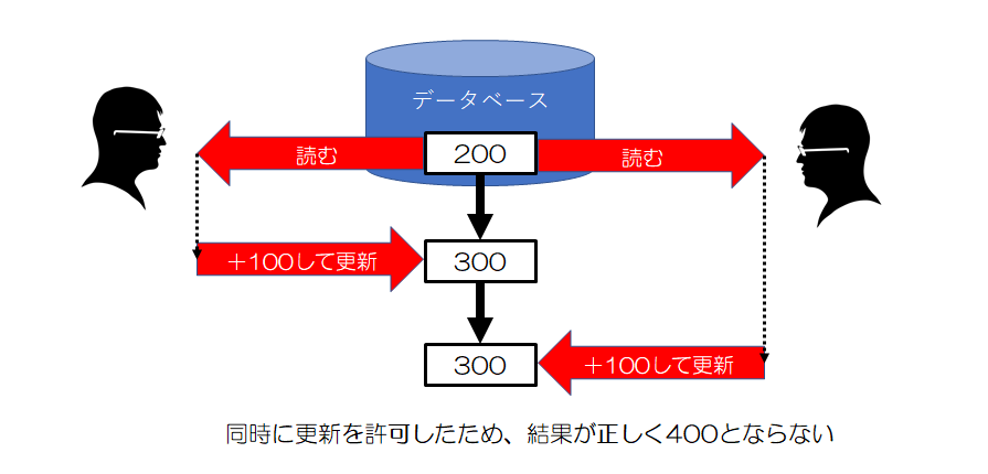 それぞれが、「読み取った値に対して100加算」という演算処理を行い、結果「300」を書き戻すと、遅いほうが速い方の結果を上書きしてしまい、本来「400」となるべきところが「300」となってしまいます。